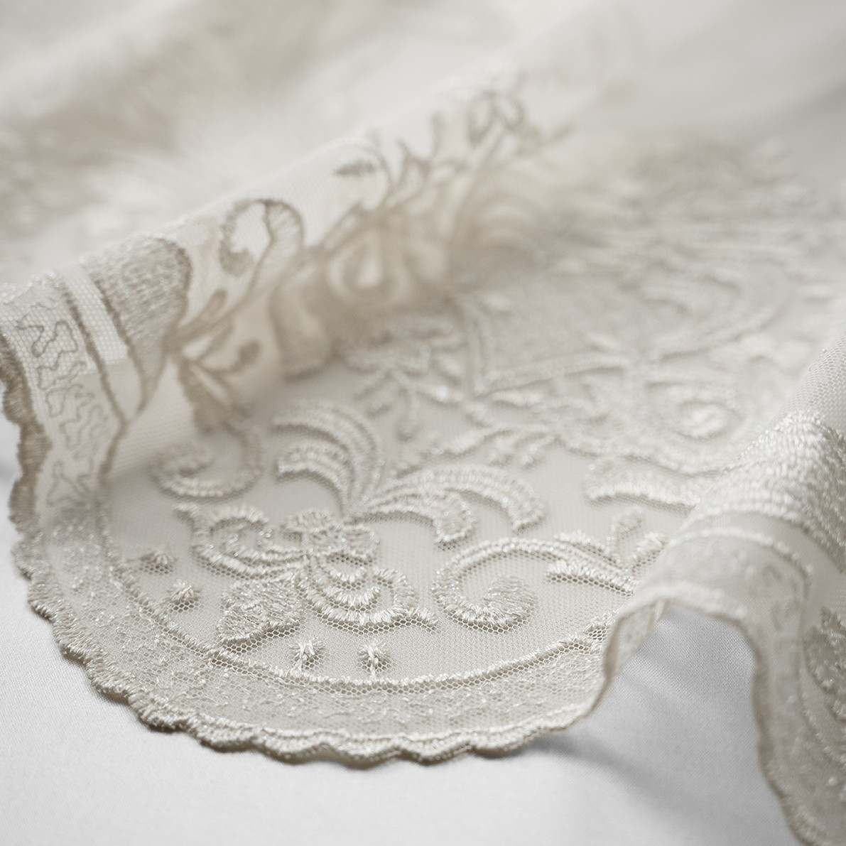 Materiál je lehký, splývavý a tvarově stálý. Lesklá nit je integrována tak, aby nenarušovala pád látky a zachovala její elegantní, vyvážený vzhled i na větších plochách.