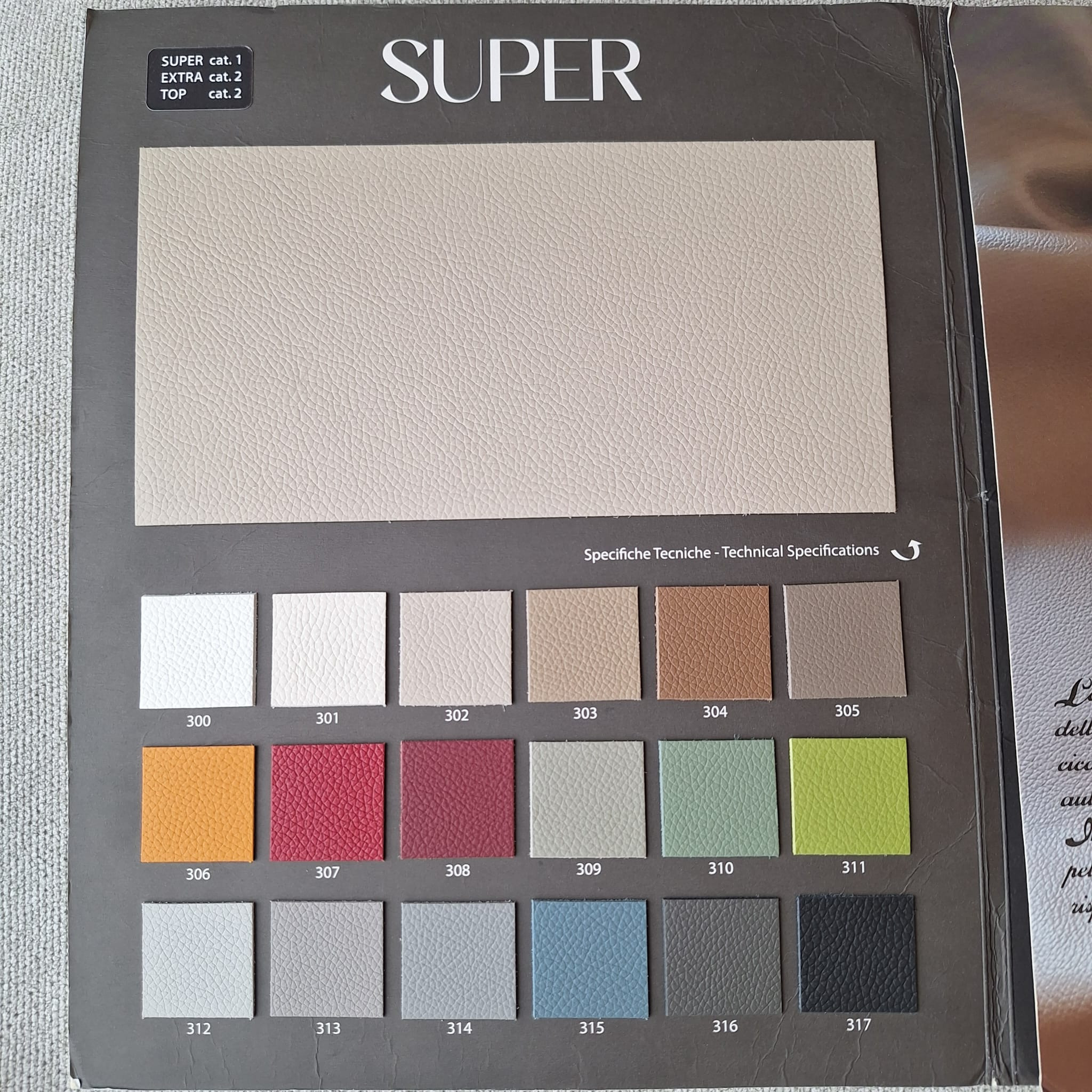 Kolekce Super je vyrobena ze 100% pravé hovězí kůže, která vyniká přirozeným vzhledem, pevností a dlouhou životností. Kůže působí autenticky a elegantně, s typickou kresbou přírodního materiálu, díky čemuž dodává interiéru nadčasový a reprezentativní charakter. Materiál je nehořlavý, a proto vhodný i do náročnějších obytných či komerčních prostor.
