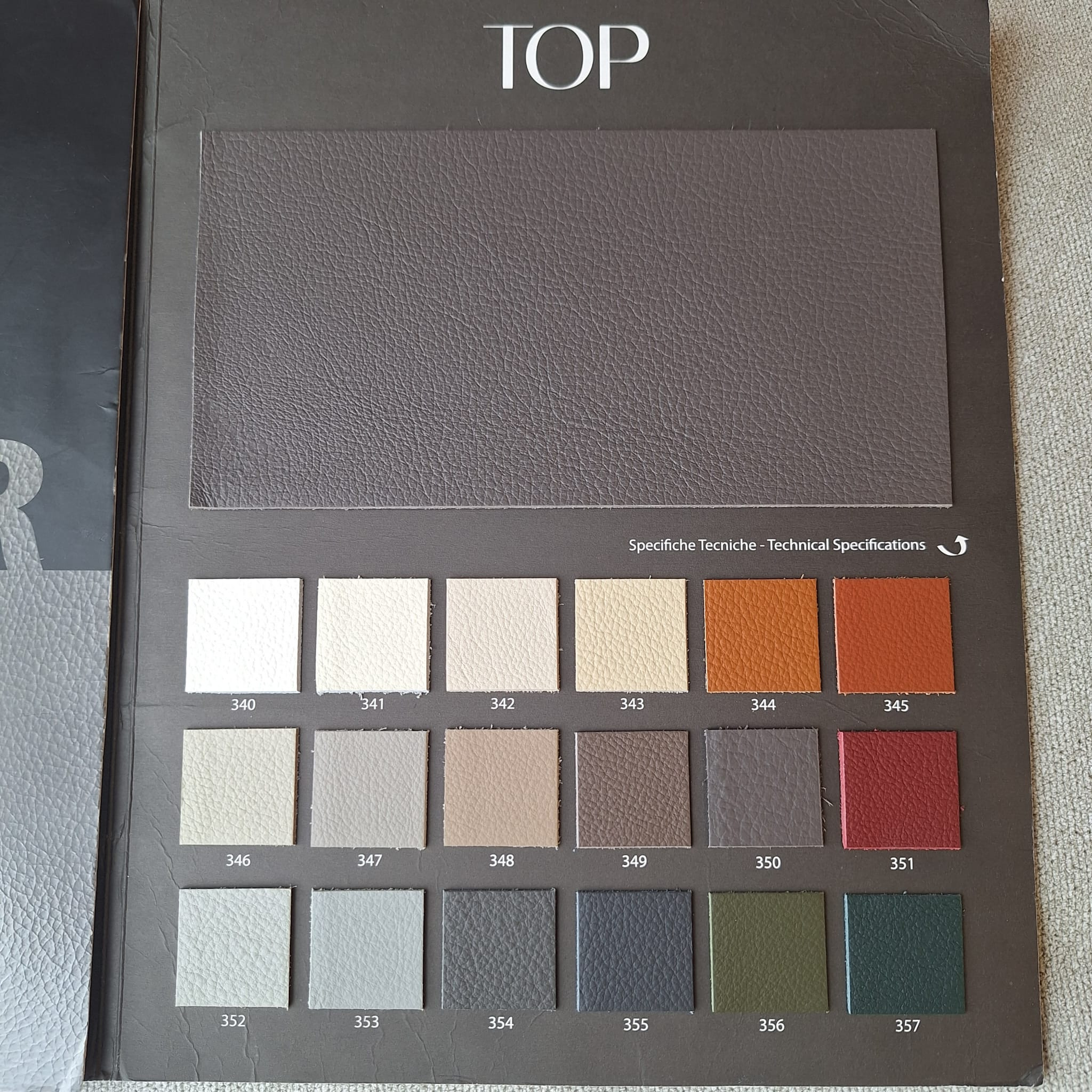 Kolekce Top je vyrobena ze 100% pravé hovězí kůže, která vyniká přirozeným vzhledem, pevností a dlouhou životností. Kůže působí autenticky a elegantně, s typickou kresbou přírodního materiálu, díky čemuž dodává interiéru nadčasový a reprezentativní charakter. Materiál je nehořlavý, a proto vhodný i do náročnějších obytných či komerčních prostor.