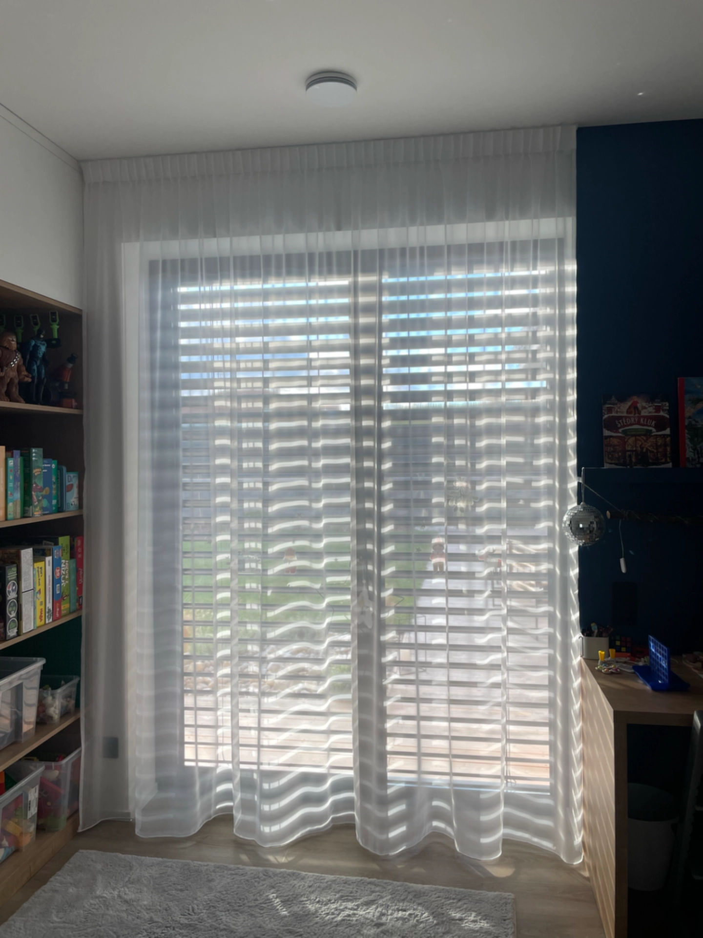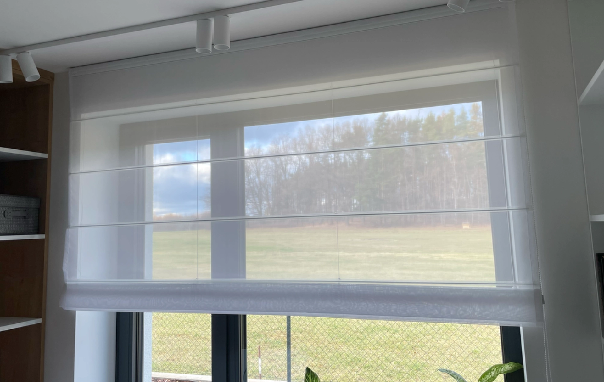 Realizace moderních záclon do rodinného domu. Náš jemný jemný odolný voál, který je skvělý na údržbu, nemačká se a vydrží dlouhá léta bez žmolkování a žloutnutí. Římské rolety z jemné záclonoviny, která plní funkci zjemnění ostrého světla v kanceláři, kde majitelka potřebuje ideální světlo na online meetingy a výuku.