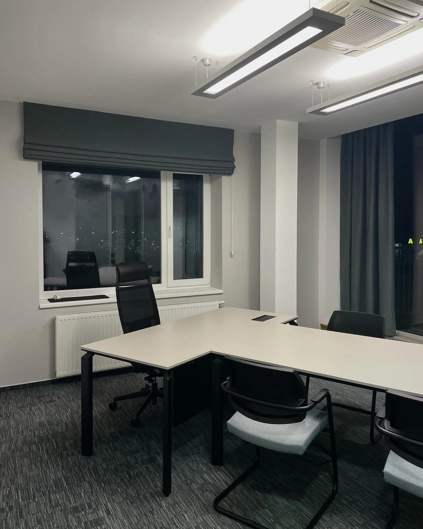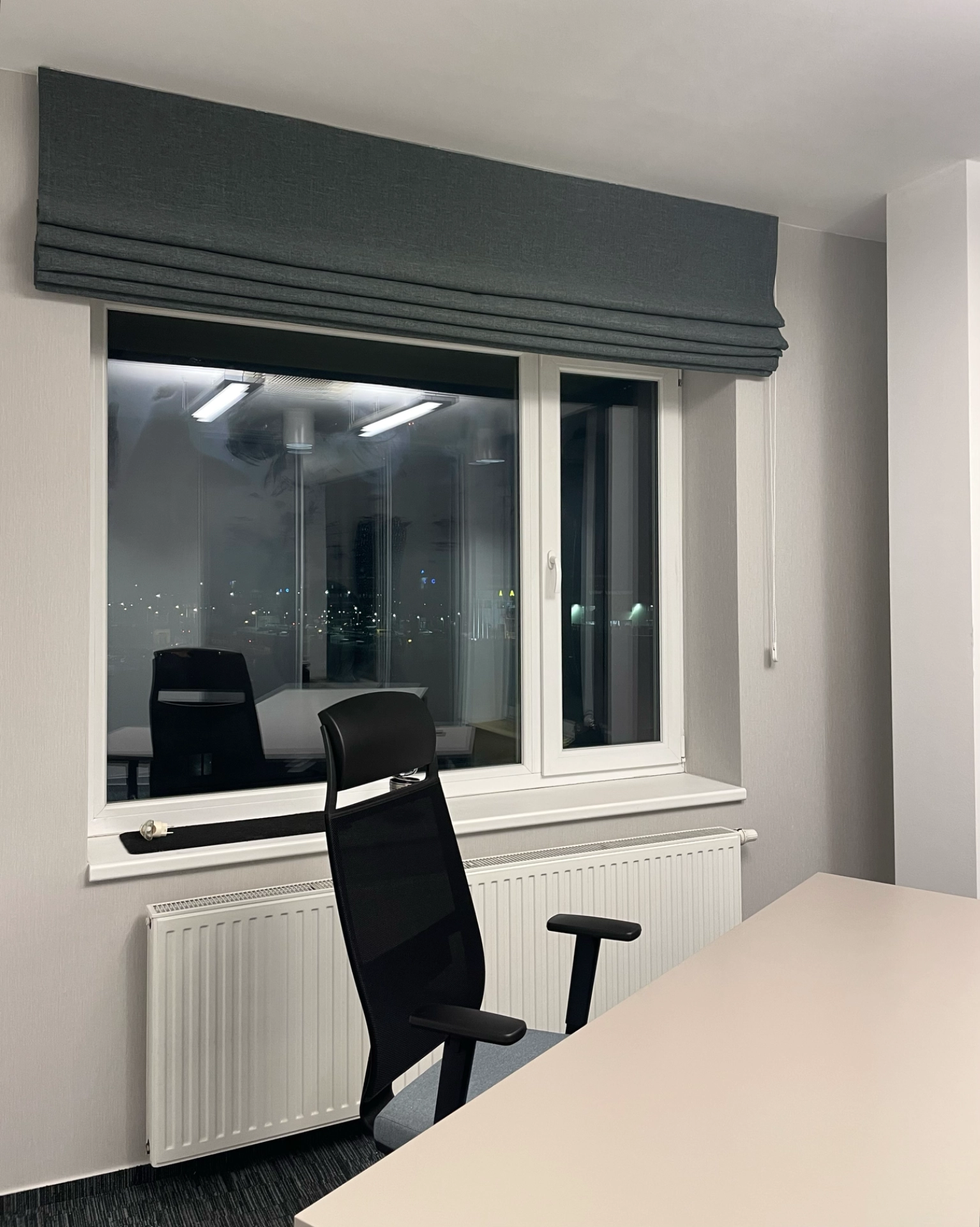 Realizace textilu do moderních kanceláří v Praze, byla vybrána jedna specifická látka, která byla využita jak na dekorativní pruh závěsu, tak i na materiál římské rolety. Tato roleta plní důležitou funkci zatemnění daného okna, čímž zajišťuje příjemné pracovní prostředí a ochranu před slunečními paprsky.