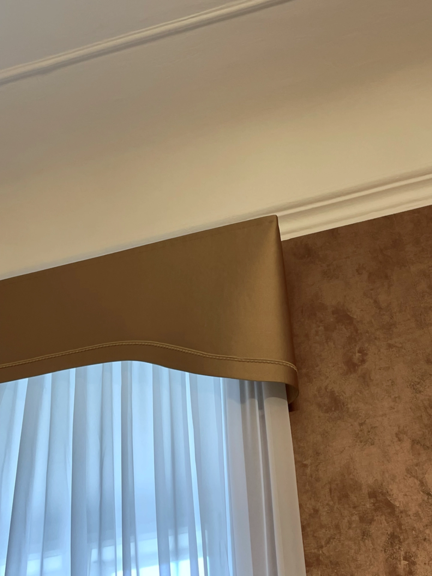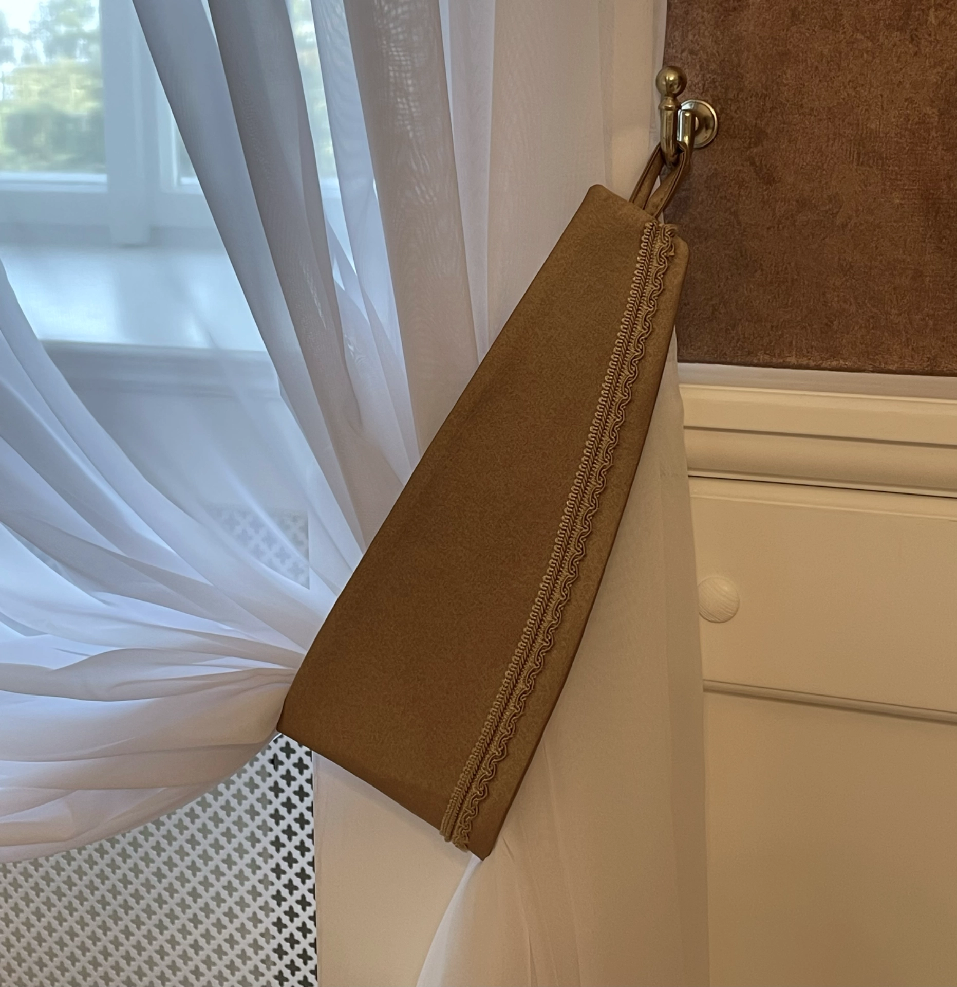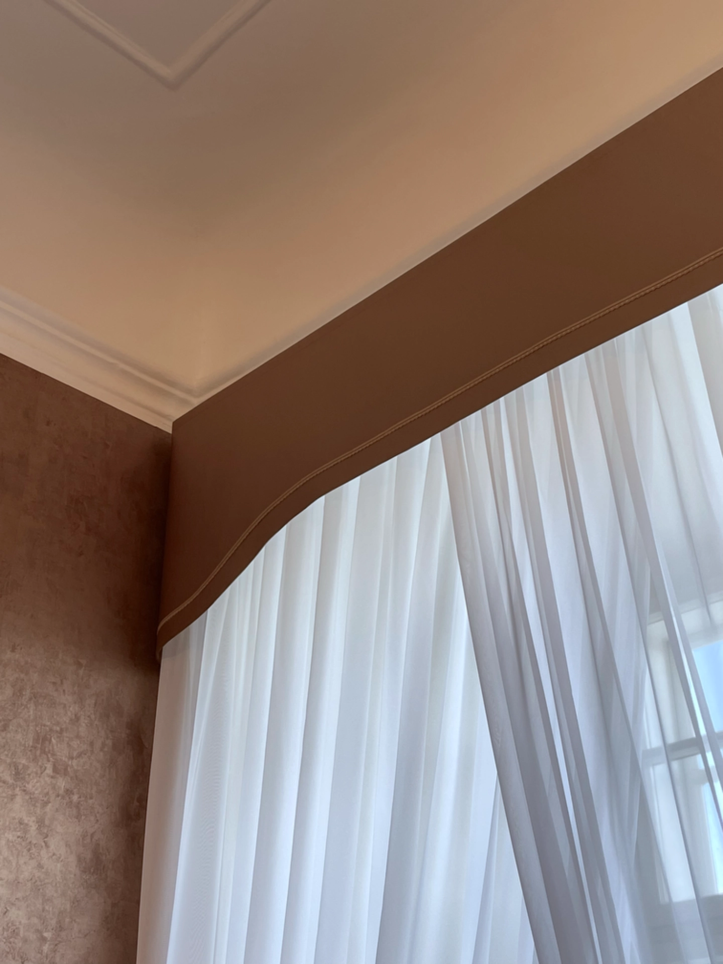 Navrhli jsme a realizovali elegantní splývavé záclony a pelmet do prostor zámečku. Použité látky dokonale ladí s odstínem stěrky a jsou obohaceny o jemné dekorativní lemy, což přispívá k celkovému stylingu interiéru. Výsledkem je harmonický a vkusný prostor, který působí útulně a zároveň dobově.